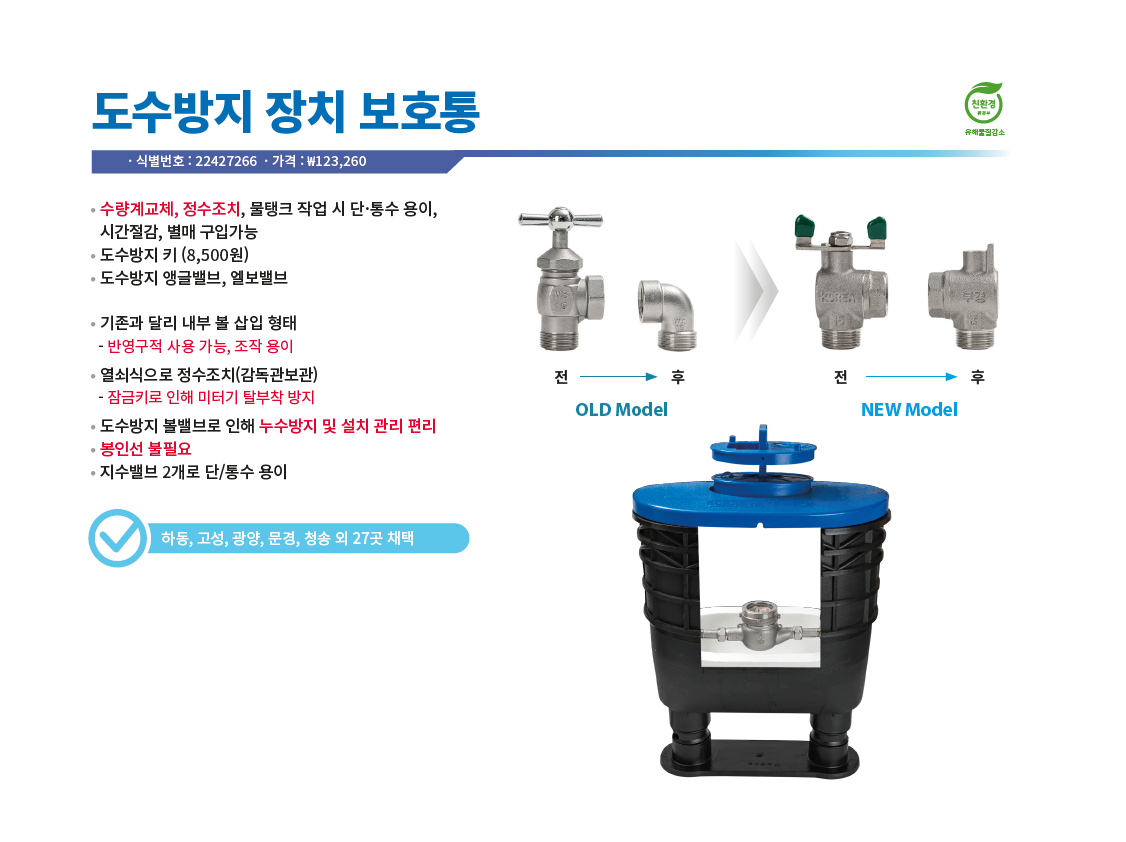 | 구성품 | STS앵글밸브+역류방지엘보+도수방지장치+동파방지보온재+PE뚜껑 |